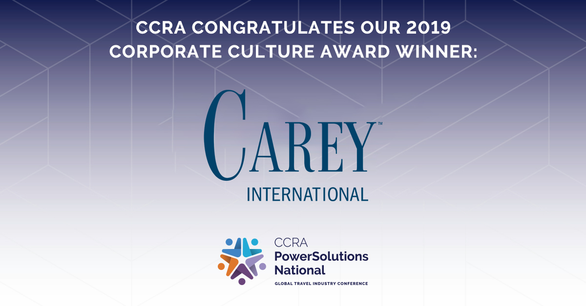 Frederick, MD., February 12, 2019 — Carey International, Inc., the leading provider of innovative chauffeured service solutions, customer-centric travel technology, and ground transportation logistics management announced, today, that it has been named the 2019 recipient of the Corporate Culture Award by CCRA Travel Commerce Network.
